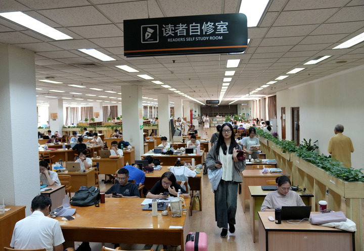 7月29日,在位于杭州的浙江圖書館曙光路館,人們在讀者自修室看書學習。近期持續(xù)高溫,不少杭州市民前往圖書館看書學習,在炎炎夏日中享受清涼。