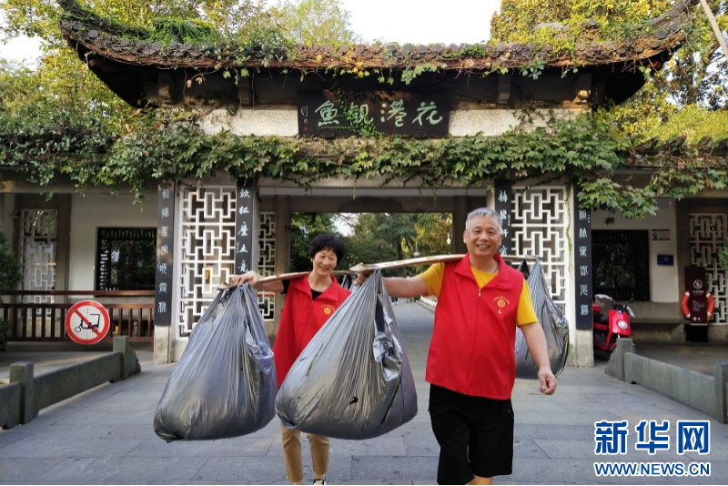 竹书鸿与妻子在西湖边清理湖面垃圾。新华网发(受访者供图)