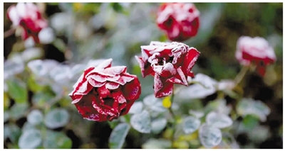 西湖景区部分位置出现了结冰现象。在杭州花圃和植物园内,花朵边缘凝结成霜,枯叶被薄冰覆盖,树上挂着冰凌,呈现冬日景象。