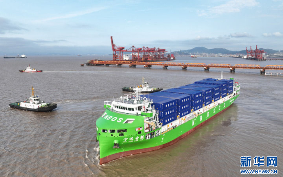 4月15日,全球最大、国内首艘万吨级纯电动智能集装箱海船“宁远电鲲”轮从宁波舟山港北仑港区启航,驶向嘉兴港乍浦港区,正式投入商业航线运营(无人机照片)。新华社发