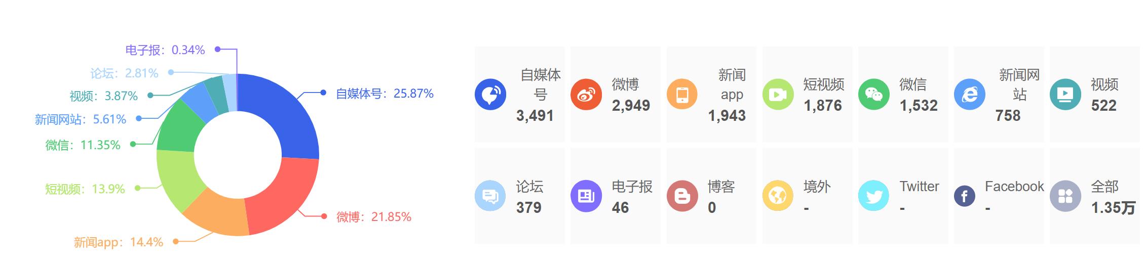 截至目前,该文章在互联网上传播总量为1.35万篇,其中10月14日是信息发布的高峰期。各信源的信息发布情况中,自媒体号信息占比最大,其次是微博和新闻APP,信息量分别为3492篇、2949篇、1943篇,占比分别为25.87%、21.85%、14.4%。(数据来源:新华睿思系统)