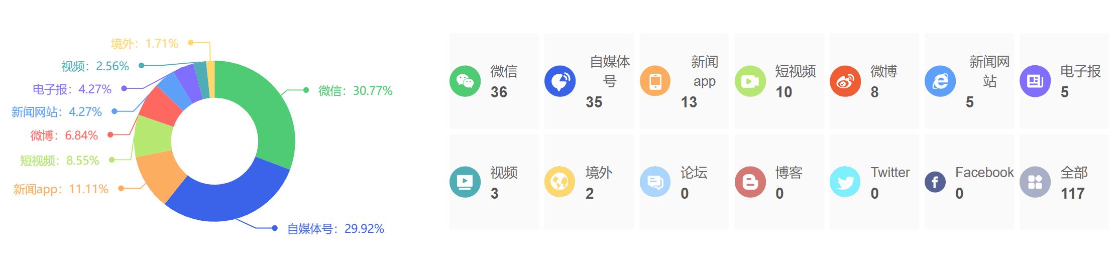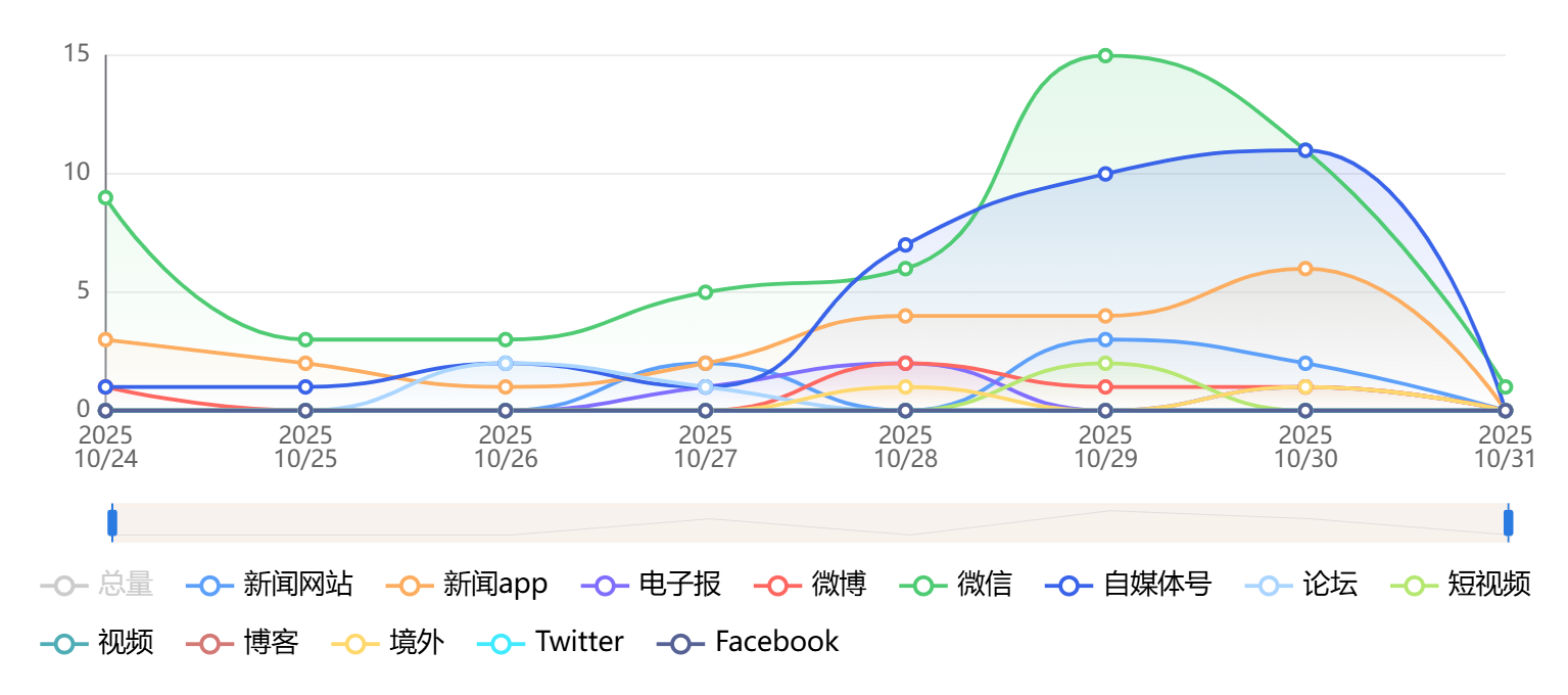 截至目前,该文章在互联网上传播总量为117篇,其中10月27日是信息发布的高峰期。各信源的信息发布情况中,微信信息占比最大,其次是自媒体号和新闻APP,信息量分别为36篇、35篇、13篇,占比分别为30.77%、29.92%、11.11%。(数据来源:新华睿思系统)