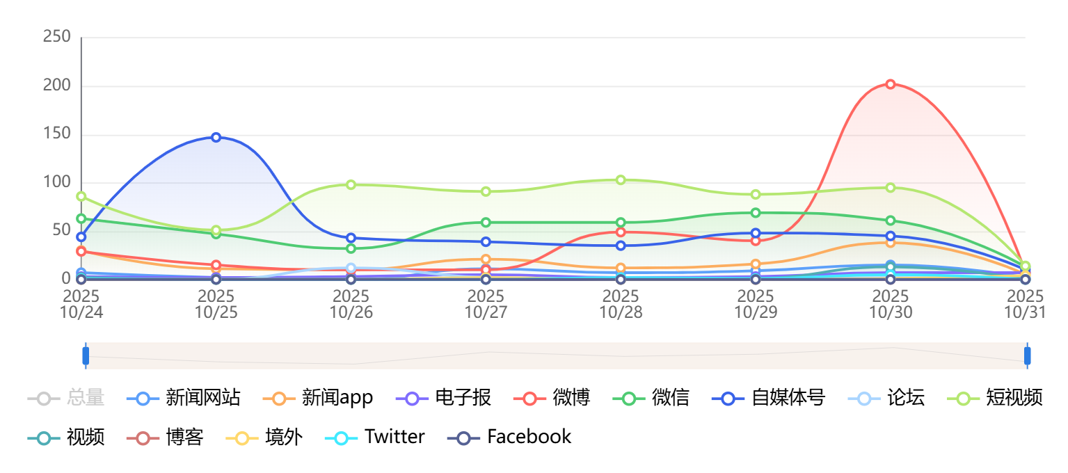 截至目前,该文章在互联网上传播总量为2078篇,其中10月30日是信息发布的高峰期。各信源的信息发布情况中,微博信息占比最大,其次是微信和自媒体号,信息量分别为626篇、411篇、403篇,占比分别为30.13%、19.78%、19.39%。(数据来源:新华睿思系统)
